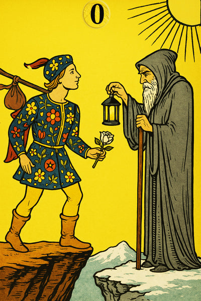 2. Exchange – The Fool offers a rose; the Hermit offers his lantern (innocence meets wisdom).