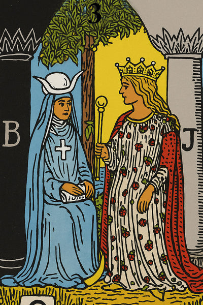 1. दो शक्तियाँ एक साथ - द हाई प्रीस्टेस (अंतर्ज्ञान) और द एम्प्रेस (रचना) एक साथ दिखाई देती हैं।